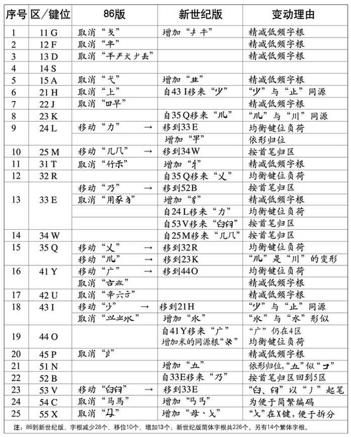 看上面有人问版本的区别,传个86到新世纪的字根变动表吧