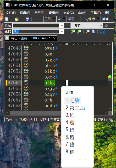 黄狗五笔超大字符集的v423.260新版,是不是没法输出扩展F区的字符了?许多之前版本有的字符,现在都 变成了笑脸符号,比如导出 - 主码 - CJKExt_A-G表的第47520至47709行字符。之前版本的导出 - 主码 - CJKExt_F能正常显示这些字符。