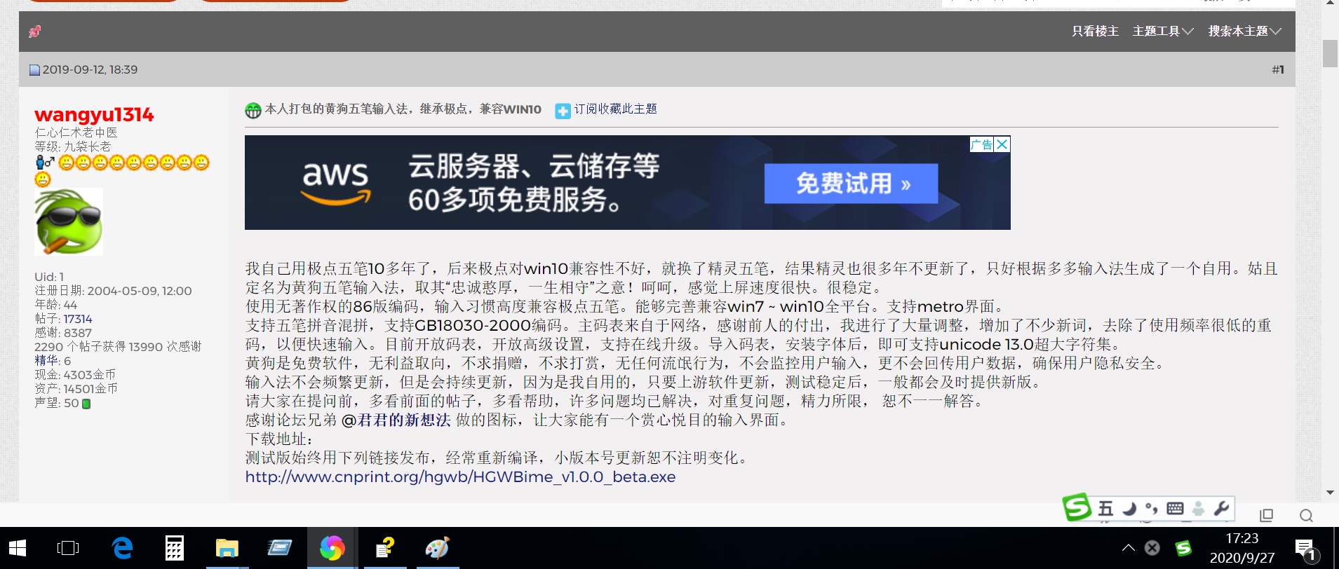 有个问题不知道是软件本来就这样的,还是适配高分屏DPI的分辨率支持不好,“状态栏窗口图标"在我笔记本电脑 1920*1080 分辨率下,看起来有点小,感觉眼睛看着累,同样是极点五笔状态栏图标就看起来舒服多了.我发几张我的截图楼主看下.希望对黄狗五笔有改进.谢谢. 截图上传论坛怎么也看不了,只能上传到免费的图床上了,下面是3张截图的链接。 此帖于 2020-09-29 15:45 被 wangyu1314 编辑. 原因: 附件本地化,删除外链! |