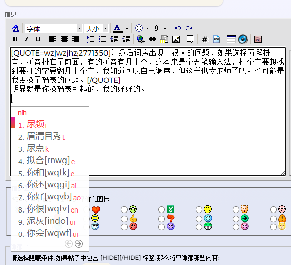 升级后词序出现了很大的问题,如果选择五笔拼音,拼音排在了前面,有的拼音有几十个,这本来是个五笔输入法,打个字要想找到要打的字要翻几十个字,我知道可以自己调序,但这样也太麻烦了吧。也可能是我更换了码表的问题。