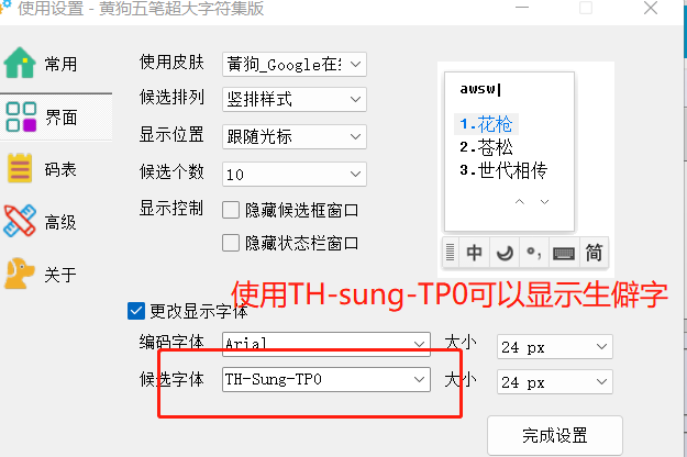 黄狗输入法,自带的字体,SimSun-ExtB,还有有些不足,在输入打字显示字框中,不能很好支持 复杂的生僻字。如:絷 字上下结构的zhi 执水 使用自定义字体 天珩全字库 中TH-Sung-TP2字体,还不错,可以显示字体。
