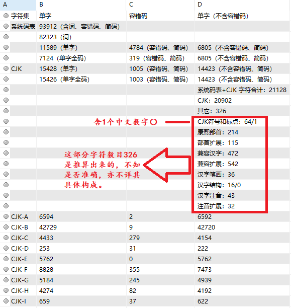 第一是全,CJK汉字基本搜罗殆尽,各种生僻字、古文用字基本尽在掌握。 第二是井然有序。系统码表、CJK、CJKA-I、符号编码、emoji、快捷命令、用户码表等等分门别类,不至于一团乱帐。哪里缺了什么或者错误出自哪里,容易定位修改,心中有数。非常非常好。早期有过其它符号、字符隐匿于系统码表的,容易产生乱帐,天下一统之前,分门别类,非常非常好。 好处还有很多,不一一列举。 要说还可以改进的地方,个人觉得有两点: 一是系统码表93912条,其中二字及以上词比较多,达82323条,不少词条没有必要,聊作充数。不过词库巨大,个人修改的话工程浩繁,作为公共词库,众口难调,取舍标准难以统一,先这么用着吧,也无大碍。 二是个别零碎处,举个栗子,【官】这个字五笔编码达6条之多,历来86五笔的正规全码是pnhn,二简是pn,有这两个编码足够了。黄狗加了三简pnh,似无必要。另外又加了容错码phnn及其二简ph三简phn。这种做法少见。使码表产生不必要的膨胀,而且助长歪风邪气。容错码不是不可以用,最好严格谨慎,不得已而用之。 说到这里,顺便说个字的编码,以前有朋友提过的【㓁】一般来说是pwu,不过pqb亦可,放眼世界,只是同字不同形而已。 作了一个简单统计,以供同仁参考,如有错误敬请不吝指正。 其实这样的科普如果由楼主M大佬亲自来做是最合适不过了。 |