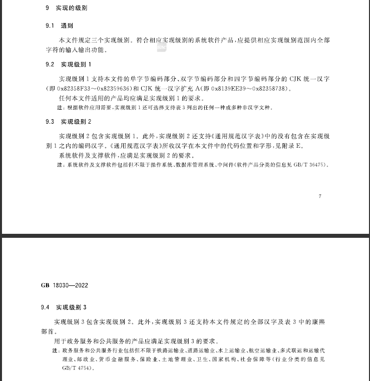操作系统只要求实现级别2,即20,976CJK+6,582CJK-A+剩余196个《通用规范汉字表》中的汉字(36CJK-B+44CJK-C+8CJK-D+108CJK-E)